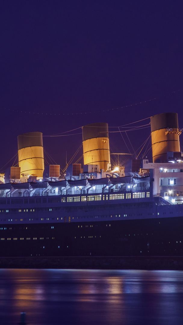 Night view of the RMS Queen Mary, Long Beach, California, United States