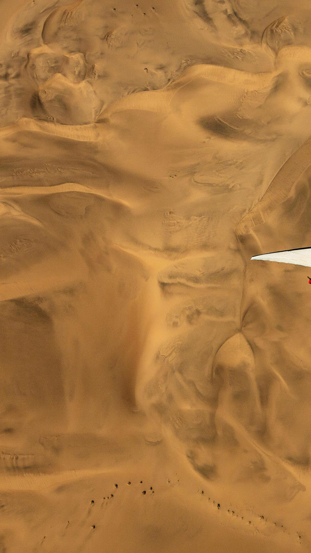 Ein Ultraleichtflugzeug fliegt über die Wüste Namibias