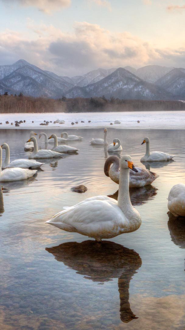 Singschwäne im Kussharo-See, Hokkaido, Japan