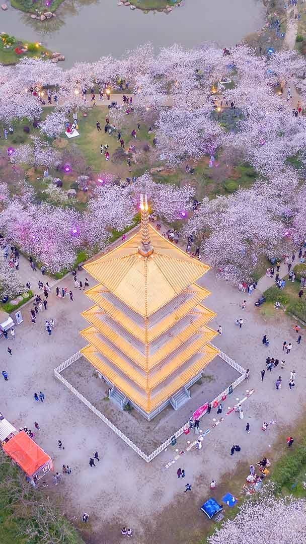 From above, East Lake Cherry Blossom Park in Wuhan, China, looks like a soft lilac cloud settled gently over the land. Thousands of cherry trees bloom at once, their pale petals forming a living canopy around a golden five-storey pagoda at the park"s heart. The pagoda rises in calm symmetry, its tiered rooflines glowing against the delicate pastels of spring.