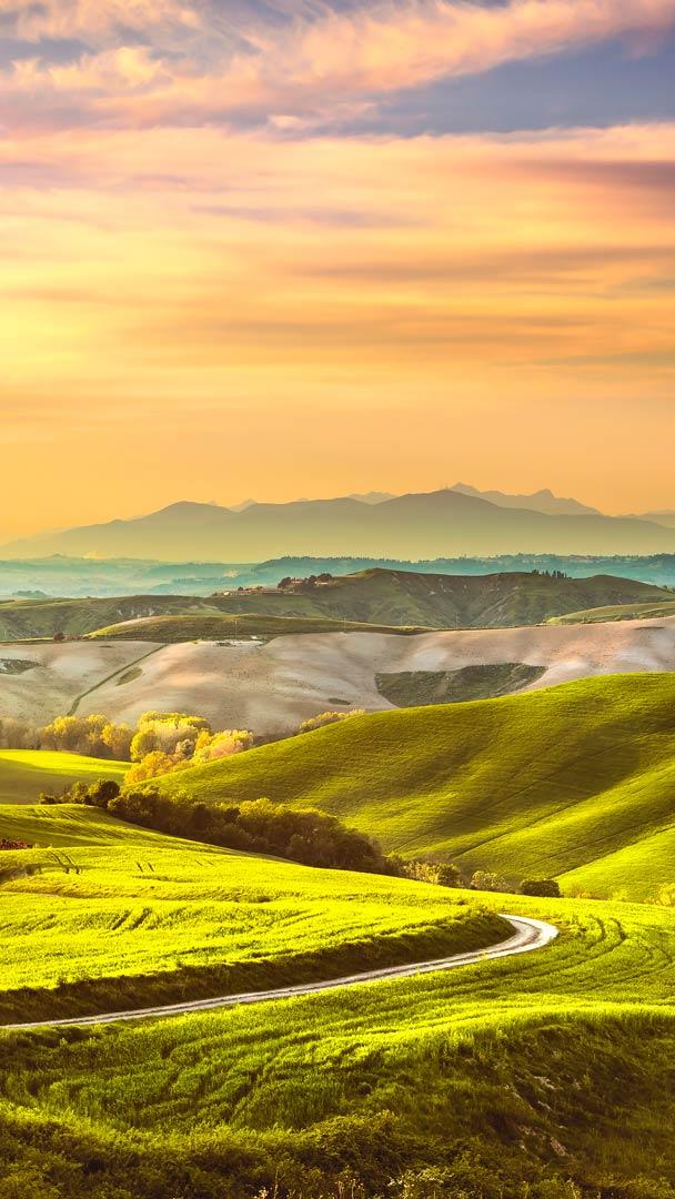 Onde bucoliche Colline ondulate al tramonto, Toscana (© StevanZZ/Getty Images)