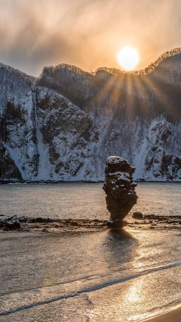 湖の岸に押し寄せる割れた氷の山